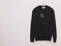 PRADAの黒カーディガンです。薄手のウール100、ヒップがすっぽり隠れるくらいの丈がありますのでワンピとして着ても可愛いです。バックギャザーがあしらわれており、ふんわり流れるようなシルエットを演出してくれます。