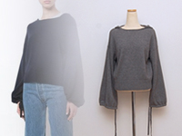 フロントはボートネック風のライン、お袖は袖先にむかって広がるようなラインがとられており腕が長く見えますのでスタイルがよりよく見えるニット。袖先は紐ギャザーでしまりますので紐箇所をしめてお袖をまくってきてもOK 肌触りもよい素材で楽ちんに着ていただけます。ご自宅手洗いOK