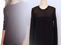 上部のみ目の粗いデザインで少し透け感のあるデザイン。とても柔らかくストレッチ性の高い質感です。ヒップ下部までのレングス、サイドはスリットあり、オーバーサイズほどではありませんが程よく隙間ができる程度のサイズ感です。こちら店頭にて試着に利用されていた現品、大体1-2回程度使用された程度のコンディションとお考えください。