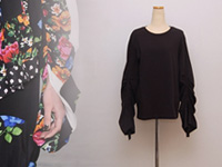 ワイド幅のクルーネック、ヒップ半分くらいまでのレングスです。わずかにストレッチの効いた素材、7号の方で比較的ゆとりあるゆるめのフォルムとなります。艶やかな上質素材で品よく着ていただけるブラウス、使用感をほぼ感じないレベルの綺麗なコンディションです。