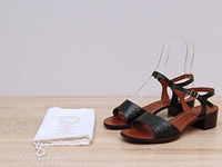 比較的最近のシーズンのお品、非常に履き心地がよく歩きやすいサンダルです。ブロックヒールタイプでカジュアル感のあるフォルムですが素材やお色が落ち着いた雰囲気で上品に履いていただけます。Heel:5cm