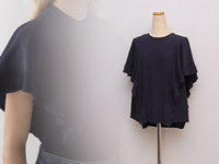最近のシーズンのお品、身頃にかかる大きなフリルデザインがおしゃれなアイテム。ゆるめのラインで着心地もよく着ていてラクチンなブラウス。落ち着いた雰囲気ですのでオフィスにもOKです。