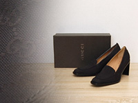 Gucciのブラック、スエードピープトウパンプスです。とてもオーソドックスな型ですがヒールの素材&立体感等ひとひねり凝ったデザインがとてもおしゃれな一足。Heel:9cm