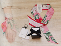 最近のグッチの新型スカーフ、タイネックスカーフ。長さも短めで色々な箇所に使用できますので画像をご確認くださいませ。