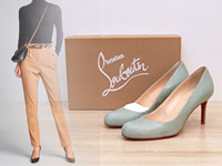 クリスチャンルブタンのパンプスです。明るいカラーですが履いた感じはすっきりとシックな印象ですのでon off 問わず履いていただけます。 足なじみのよい柔らかいスエード&ローヒールですので一日履いても疲れずデイリーに履きまわすシューズとして最適な一足。Heel:4cm