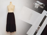 ウエストは大きめにとられており、紐でしめて着用する形です。ハイウエストでもローウエストでもどちらでも使用可。足首より少し短い程度のレングスです。裾にはアイレットレースがあしらわれ重さは感じず綺麗なライン、どなたでもおしゃれに履いていただけるかと思います。こちら店頭サンプルアイテム、ウエスト紐に若干のスレがみられます。また軽く糸くず付着あり。