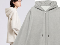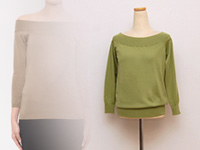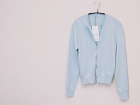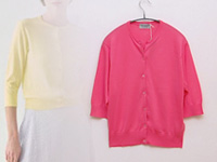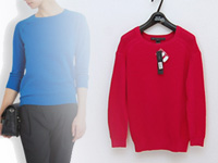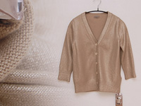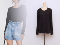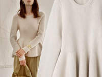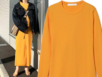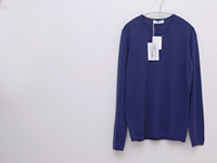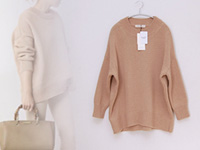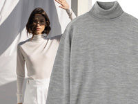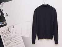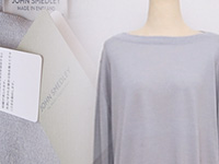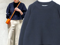 比較的コンパクトなフォルムの薄手ニット、タイトめですがピタっとはしない程度のフォルムです。袖先がつまったデザインで風の侵入を防ぎますので、薄手ながら寒い時期にもOKな防寒力の高いニット。さらさらした素材感で肌触りも◎