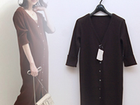 張り感のあるリブ素材、足首より少し短い程度のレングスです。ボタンを全部しめてワンピとしても着用できます。7号の方でボタンを全部しめてもボディーラインを拾わない程度のフォルムです。使い勝手のよいロングカーディガンです。定価:17000円+tax
