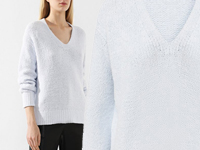 お袖は八分程度、薄手で透け感がありますのでインナーが必要です。ほどよくゆとりのあるシルエット、かなり軽い質感ですので着心地よく、ラクチンなサマーニットです。